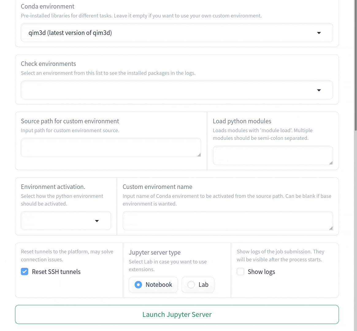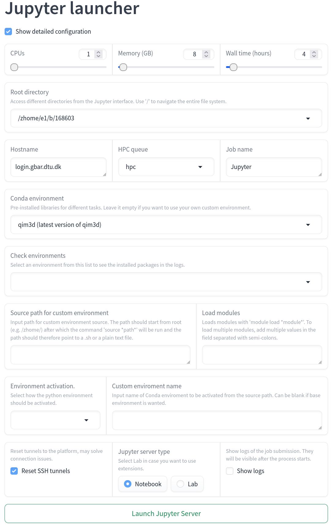 https://platform.qim.dk/tools/jupyter-launcher?cpus=2https://platform.qim.dk/tools/jupyter-launcher?mem=16https://platform.qim.dk/tools/jupyter-launcher?walltime=8https://platform.qim.dk/tools/jupyter-launcher?rootdir=/dtu/3d-imaging-center/projects/2024_QIM_platform/analysis/https://platform.qim.dk/tools/jupyter-launcher?hostname=login.hpc.dtu.dkhttps://platform.qim.dk/tools/jupyter-launcher?queue=gpua100https://platform.qim.dk/tools/jupyter-launcher?name=MyJupyterSessionhttps://platform.qim.dk/tools/jupyter-launcher?qim_env=dvc-spamhttps://platform.qim.dk/tools/jupyter-launcher?source=/dtu/3d-imaging-center/QIM/conda/miniconda3/bin/activatehttps://platform.qim.dk/tools/jupyter-launcher?module=python3;gcchttps://platform.qim.dk/tools/jupyter-launcher?activator=conda activatehttps://platform.qim.dk/tools/jupyter-launcher?env=qim3dhttps://platform.qim.dk/tools/jupyter-launcher?reset_tunnels=Falsehttps://platform.qim.dk/tools/jupyter-launcher?jupyter_type=LabPlease note, that either a default QIM environment should be specified or a custom environment (or neither, resulting in the qim3d environment). Specifying both will result in errors during launch of the Jupyter Server. This includes all specifications of the custom environment.