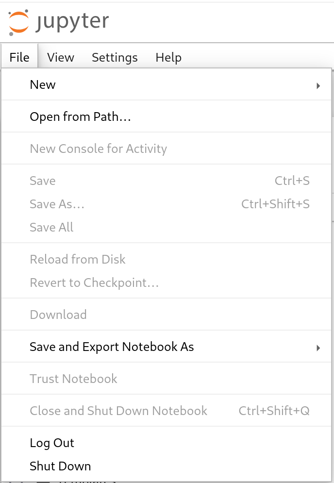 1) In the Jupyter Notebook file directory interface, select File -> Shut down