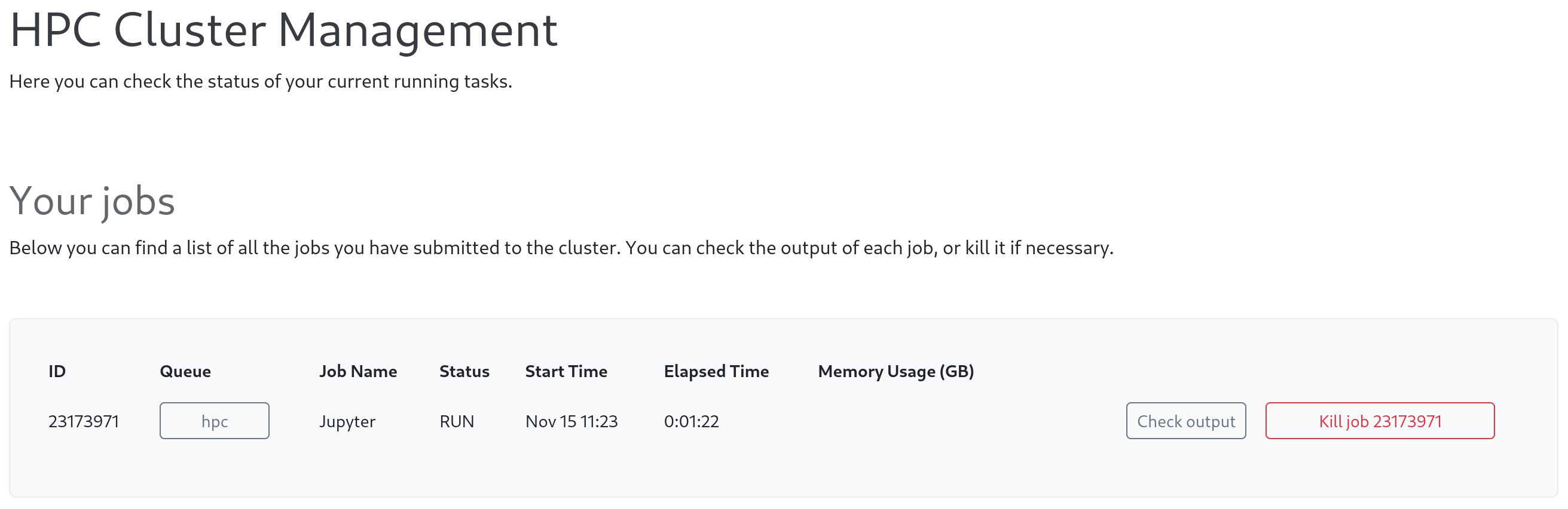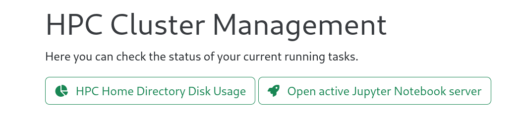 If you accidentally close the tab with the Jupyter session along with the launcher, you can reopen the session by clicking the button Open active Jupyter Notebook server on either the Jupyter launcher page or the HPC Cluster page: